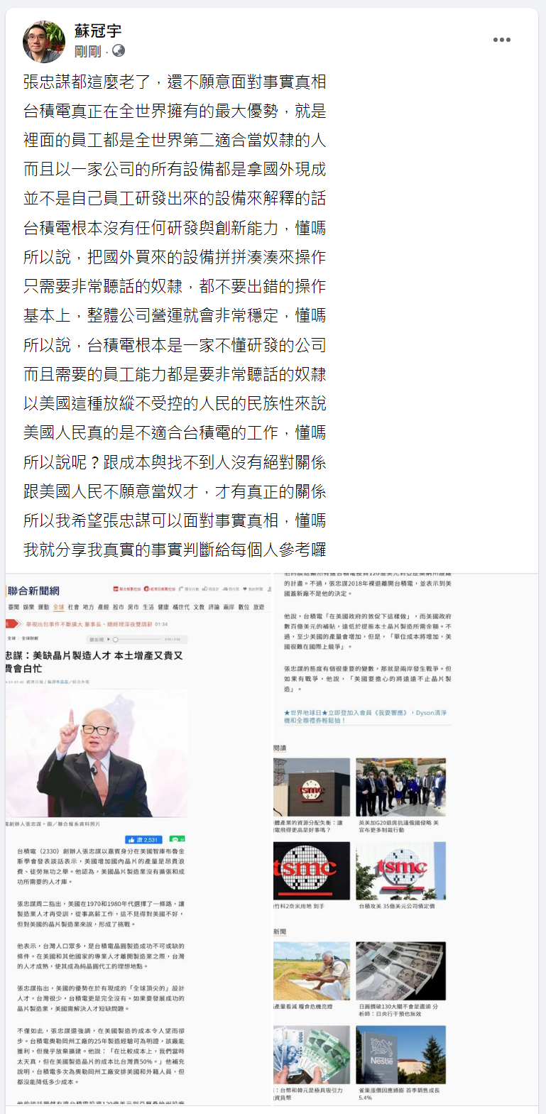 台積電真正最大的優勢與機密,就是擁有全世界第二適合當奴隸的台灣人民來當員工,懂嗎
