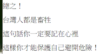 總之!台灣人都是畜牲,這句話你一定要記在心裡,這樣你才能保護自己避開危險!